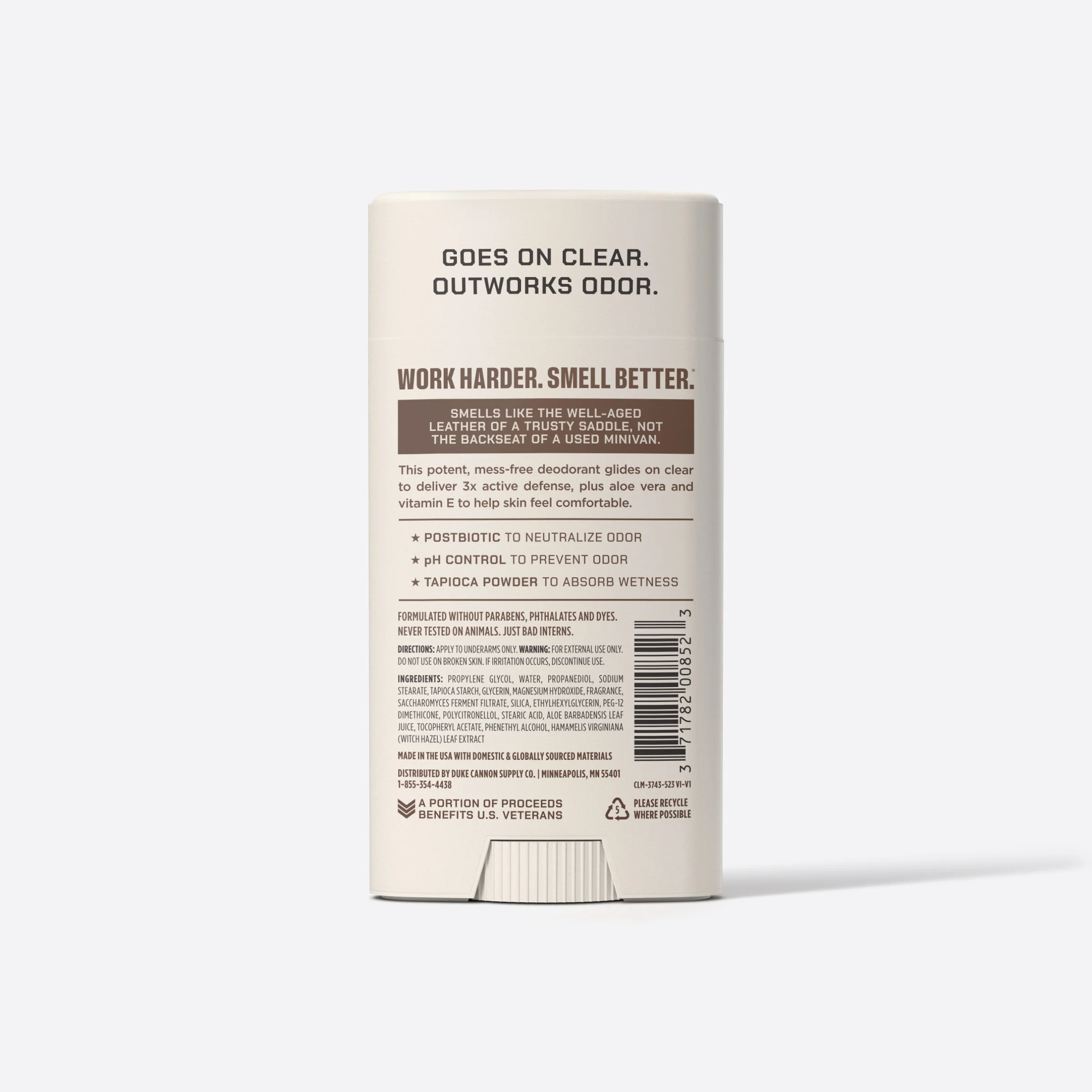 Duke Cannon lives by a simple motto: work hard, smell better. While most men find it difficult to do both at the same time, Duke Cannon has a hackāthis potent aluminum-free menās deodorant. It glides on clear for mess-free odor defense that works as hard as you do and contains soothing aloe and vitamin E to help skin feel at ease.